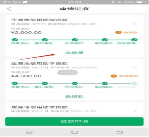 第7步:放款成功后,学生在申请进度页面点击“去缴费”自主缴纳学费。
