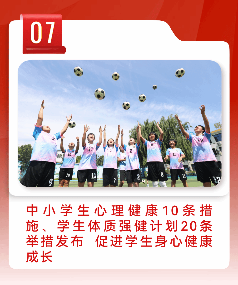 10月9日,教育部出台《进一步加强中小学生心理健康工作十条措施》,在缓解学生考试开学焦虑、落实“体育每天2小时”、保障充足睡眠时间、培养健康用网习惯等方面作出具体部署,并就关心关爱特殊学生群体、建立监测预警和干预机制、推进实施全员育心制度、优化校园心理支持环境、培育家庭和谐亲子关系、健全部门协同防护机制等作出要求,旨在全面提升中小学生心理素质,促进身心健康成长。11月7日,教育部等五部门联合印发《关于实施学生体质强健计划的意见》,大力践行健康第一教育理念,锚定强健学生体质、促进身心健康目标,提出20条具体举措,从明确中小学生每日体育活动时间、构建学校体育竞赛体系,到畅通体育人才成长通道、建设国家级示范校,全面提升学生体质健康水平,就深化学校体育综合改革进行系统部署。明确提出到2027年,以义务教育阶段为重点中小学生每天综合体育活动时间不少于2小时要求全面高质量落实。《意见》是首个以促进学生体质强健为主题的政策文件,是今后一个时期学校体育改革发展的专门性统领性文件。在教育部的引领推动下,一年来各地以学校体育小切口推动“五育”并举新突破,实现素质教育大变革,校园更加生动活泼,学生“身上有汗、眼里有光”逐步成为现实。