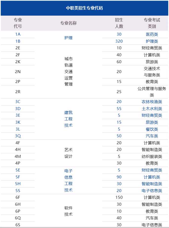 招收“中职类”考生的招生计划按专业类别分为:农林牧渔类、土木水利类、财经商贸类、计算机类、电子信息类、智能制造类、公共管理与服务类、文化艺术类、旅游类、餐饮类、纺织服装类、医药类、护理类、交通技术与服务类、材料化工与资源环境类、教育类、汽车类。考生按所属专业类别填报对应专业类别招生的学校及专业,不得跨类别填报。
