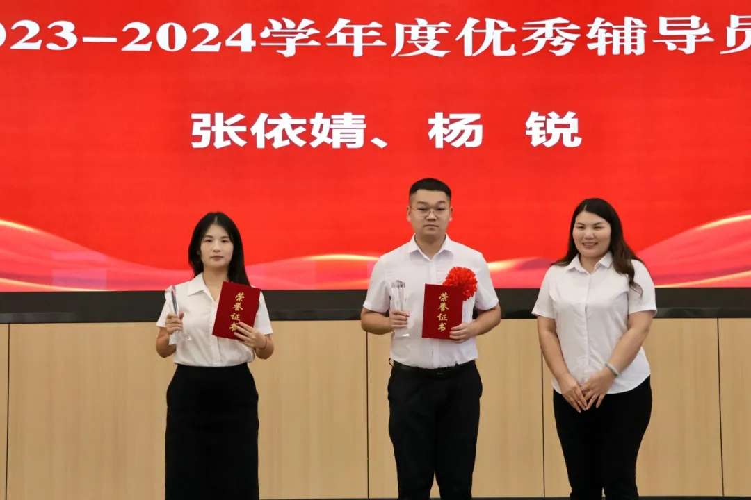 (副校长薛祖平为张依婧、杨锐等2名优秀辅导员颁发荣誉证书)