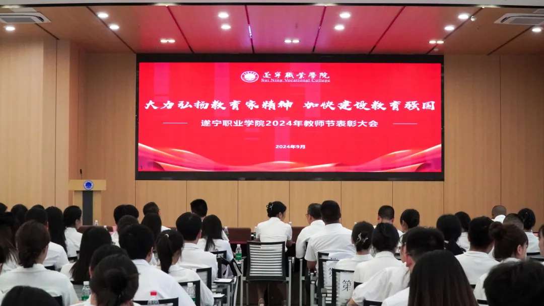 庆祝第40个教师节表彰大会在热烈而庄重的氛围中圆满落幕。遂宁职业学院将继续践行习近平总书记培养党和人民满意“四有”好教师的殷切嘱托,怀着“为党育人 为国育才”的赤诚初心,为遂职的高质量发展不懈奋斗,擘画新时代下遂职发展的新蓝图。