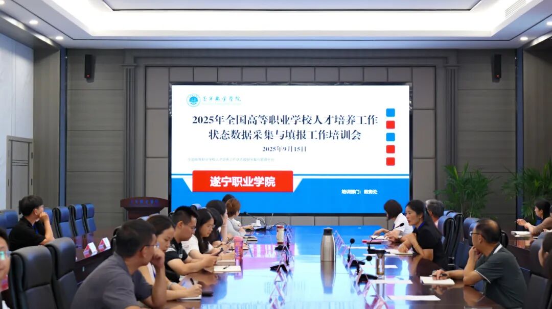 2025年9月15日,我校在明德楼5108会议室召开2025年全国高等职业学校人才培养工作状态数据采集与填报工作培训会,旨在高质量完成2025年度数据填报任务。本次培训由遂宁职业学院教务处组织,遂宁职业学院副校长龙春艳主持,教务处处长助理刘明菊主讲,各相关职能部门负责人与数据填报员参会。
