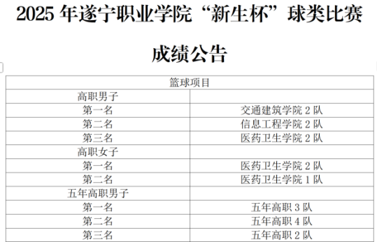 近日,遂宁职业学院2025年“新生杯”球类比赛顺利完成全部赛程。自11月24日开赛以来,这场覆盖篮球、足球、排球、乒乓球、羽毛球五大项目的校园体育赛事,历时18天,为全校学子提供了展示运动风采、锻炼综合素养的实践平台。